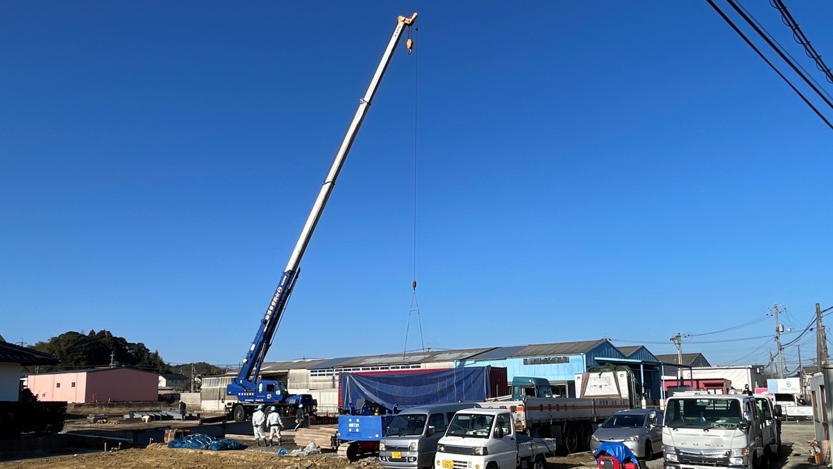 島根県東部の倉庫新築工事の現場にて建方工事が始まりました。先週のぐずついていた天気とはうって変わった晴天で一安心です。これから鉄骨がどんどん組みあがっていきます。