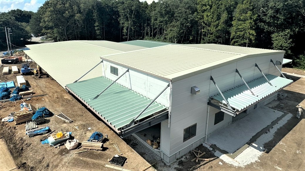 N運送会社倉庫新築工事ですが、現在屋根工事を行っております。鉄骨組立中でも大迫力だと思っていましたが、壁や屋根で形が整ってくると更に迫力が増しています。